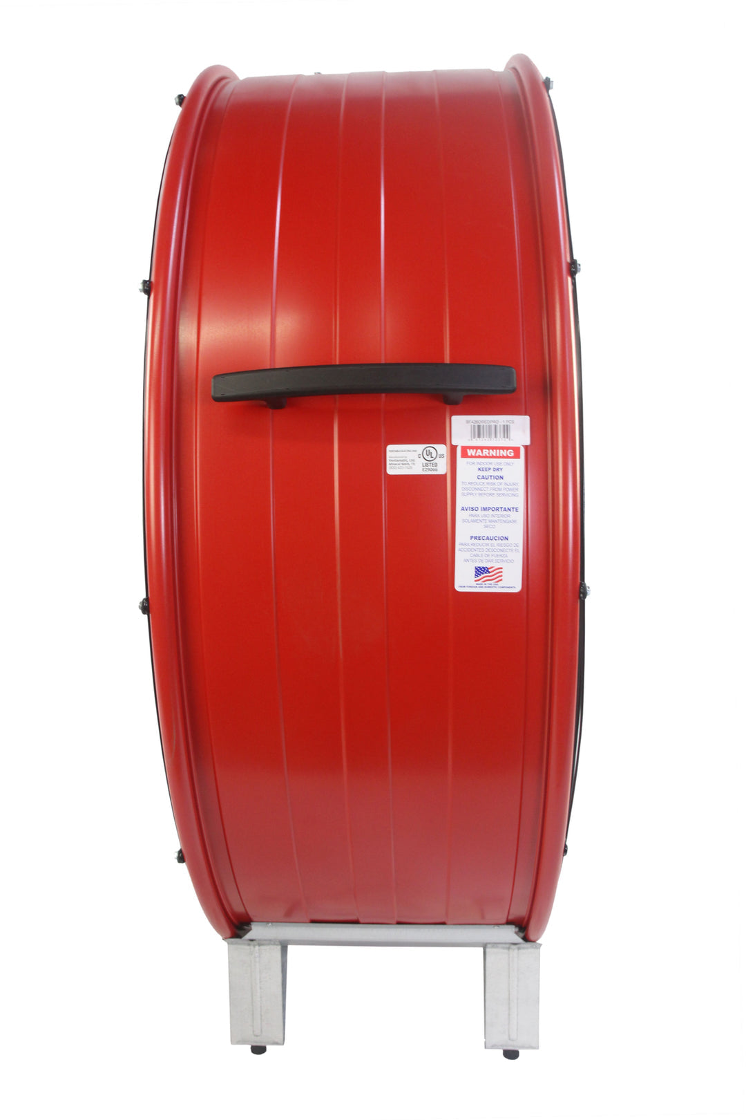 The MaxxAir 42 in. 2-Speed Portable Drum Fan is a big air mover. This fan is ideal for moving large volumes of hot air quickly and efficiently to keep people and machines cooled off. The MaxxAir 42 in. is useful indoors, on the factory floor, in a warehouse or in a barn with livestock where high-velocity air movement is needed. This fan is belt-driven for quieter operation and longevity and has a rugged, 22-gauge steel powder-coated housing for durability. The grille is OSHA compliant, rust resistant and powder-coated. The fan is shipped completely assembled, to operate simply plug into a standard outlet. The product is backed by a 2 Year Limited Warranty and made in the USA.
